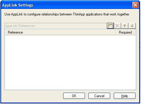 The AppLink (Application Link) feature enables you to configure relationships between ThinApp applications that work together. You can set AppLink settings for the current ThinApp application on the AppLink Settings dialog box, which is opened by clicking the AppLink Settings option in the More Options menu of the ThinApp Assistant Build Options page.