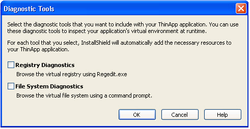 3. If you want to include the Registry Editor (regedit.exe) with your ThinApp application so that you can browse the registry at runtime from within the virtual environment, select the Registry Diagnostics option.