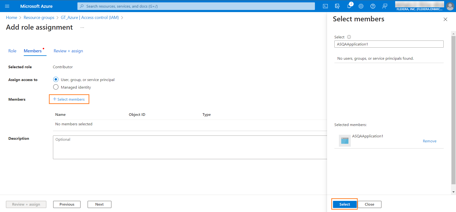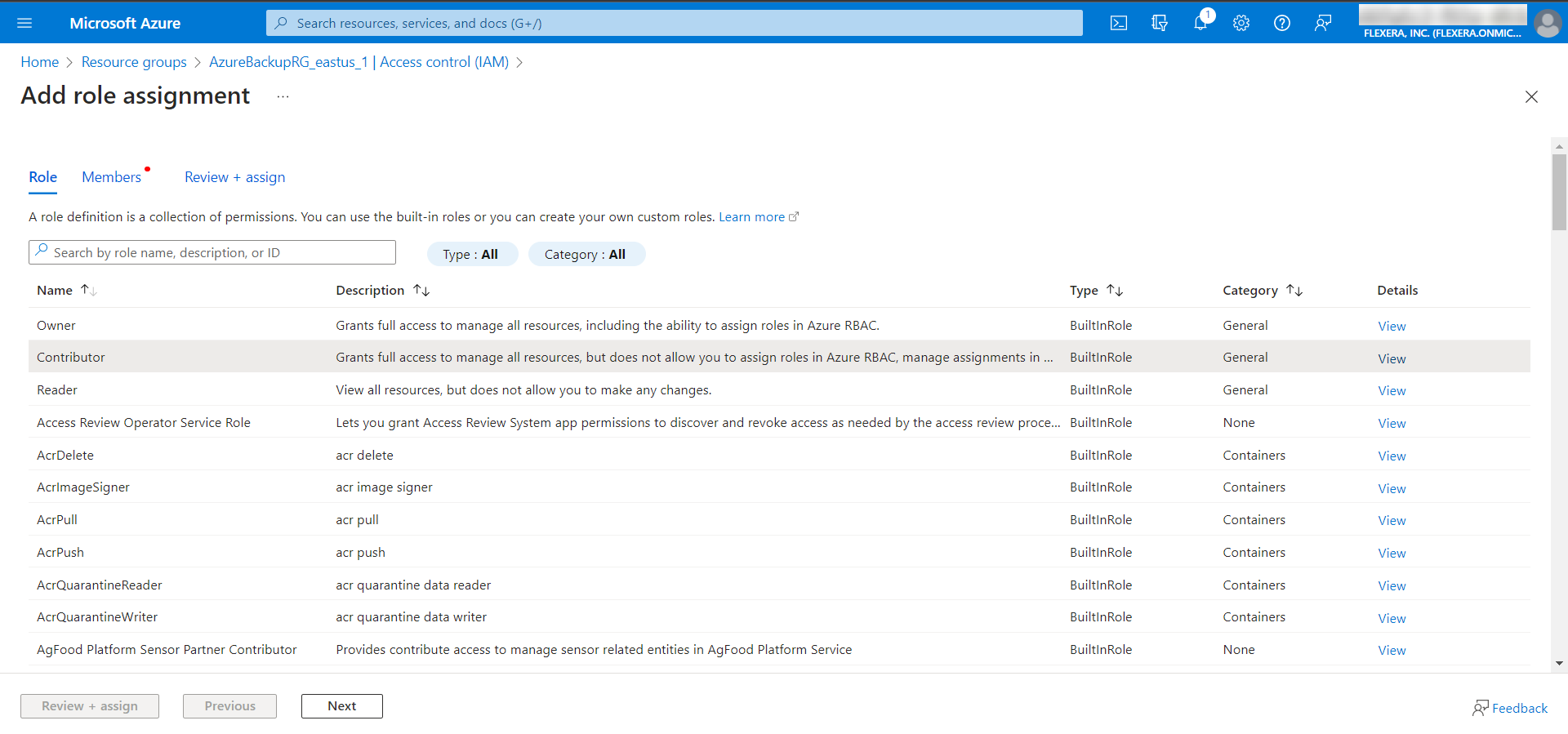 - In the Role tab, select Contributor from the list of roles.