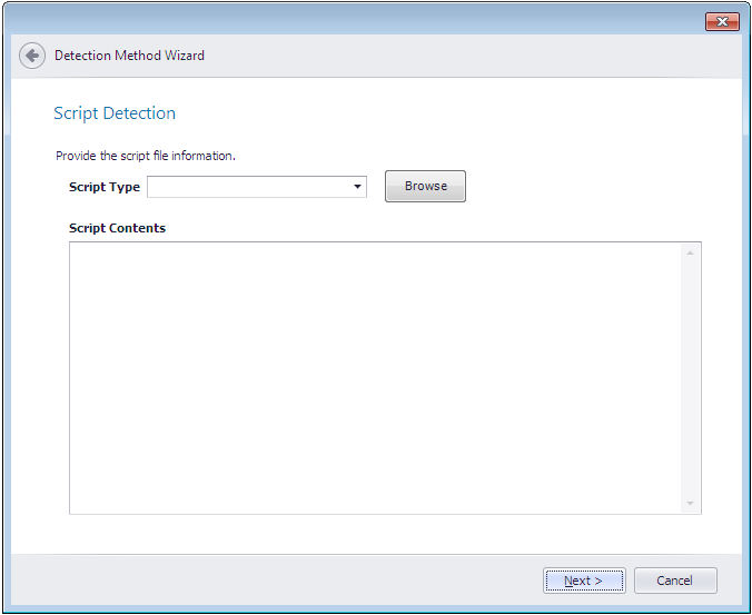 | Script Type | First, select one of the following options: PowerShell , VBScript , or JScript . Next, click the Browse button and select the script that you want to use for this detection method. You also have the option of entering or pasting the script code directly into the Script Contents box. |