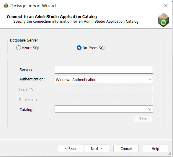Select AdminStudio Application Catalog and click Next. The Connect to an AdminStudio Application Catalog panel opens.