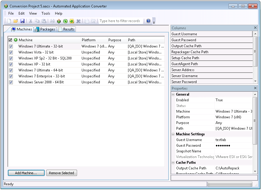 On the Machines tab of the Automated Application Converter, you add a list of clean virtual machine images to use during automated repackaging.