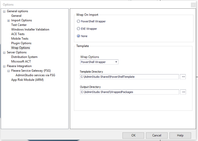 On a new tab of the Application Catalog Options dialog box, Wrap Options, you can set an option automatically to wrap a package during import from the template, you can specify the location of the template directory and the output directory for PowerShell Wrapping and EXE Wrapping by selecting the option from the “Wrap Options” drop down menu.