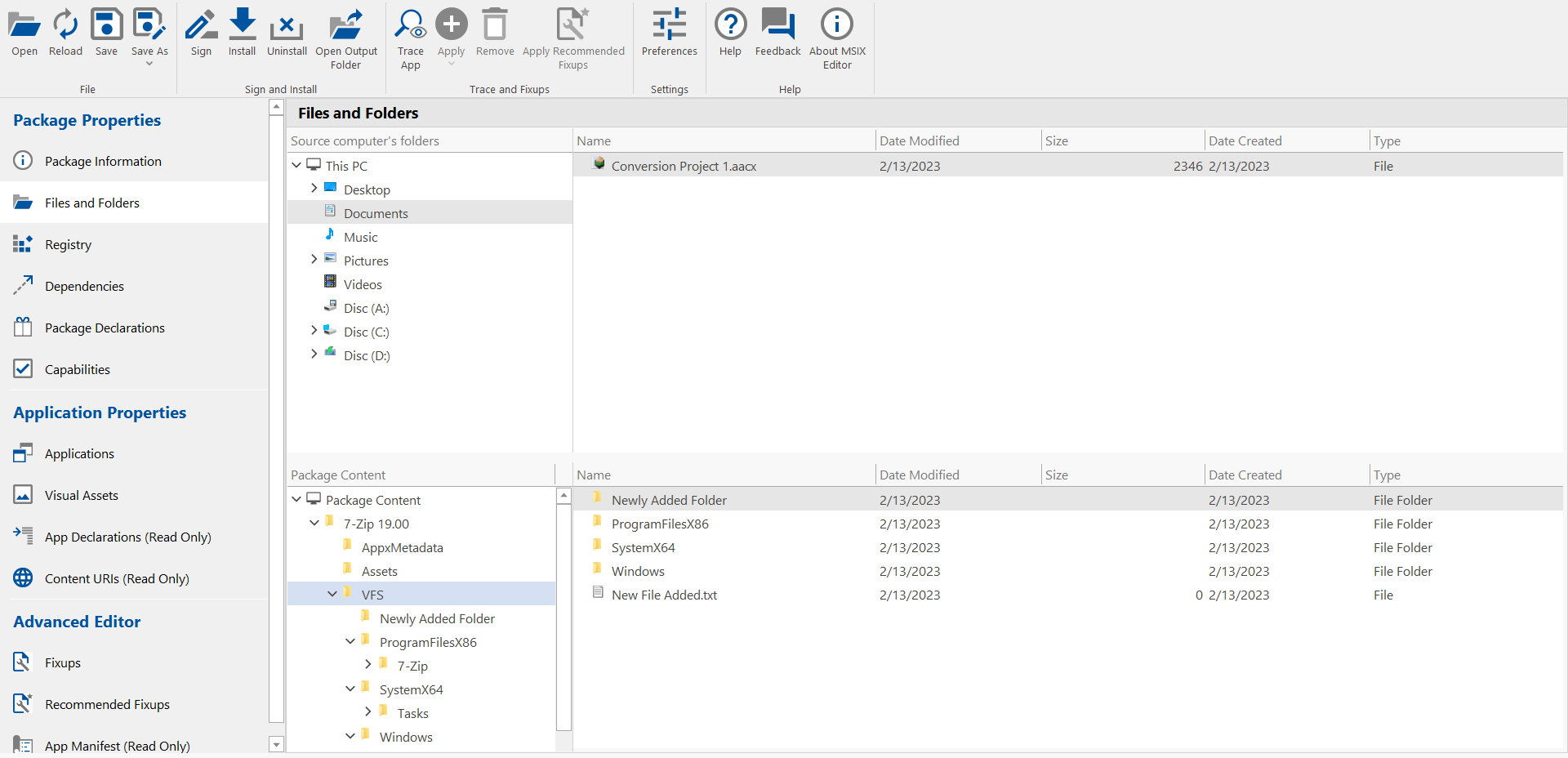 The Files and Folders view of the MSIX Editor lets you add a file or folder to your MSIX package.