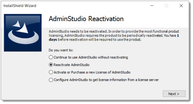 Select Reactivate AdminStudio and click Next.